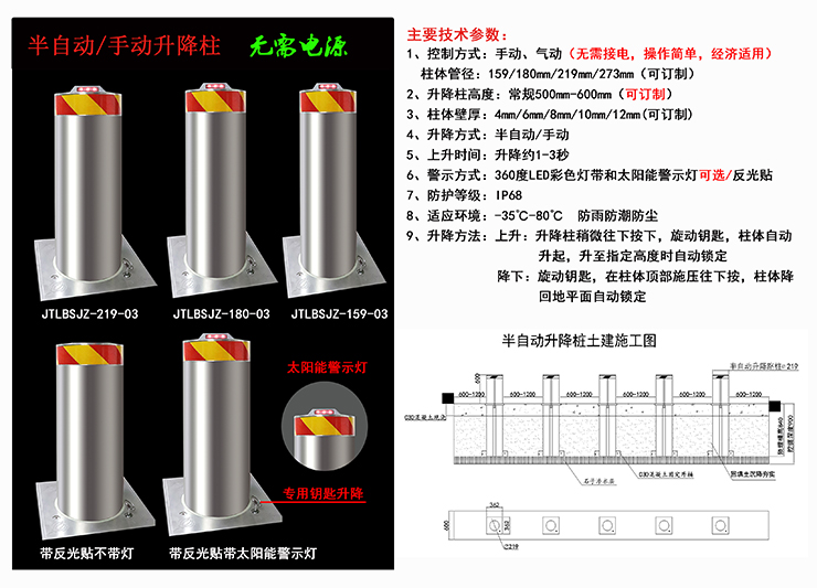 2、優(yōu) 點(diǎn):具有較強(qiáng)的抗沖撞能力,升降速度快,反應(yīng)靈活快速,對人員密集區(qū)域人身安全有力保障。